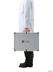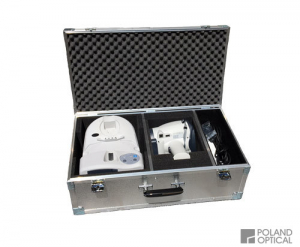Zarówno urządzenie główne, jak i stacja dokująca mogą być szybko i kompaktowo zapakowane w wygodną walizkę. Wyposażenie walizki stanowi prosty w przenoszeniu blat z montowanym podbródkiem, który umożliwia pomiar stacjonarny poza gabinetem. Eliminuje on drżenie ręki i ułatwia otrzymanie dokładnego pomiaru.